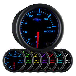 Construction and Features. Designed with a matte black finish and a racing red needle, this boost gauge offers precise readings and enhances your vehicle’s interior. It also includes 7 backlight color options, allowing you to customize the display to match your preference or dashboard lighting. With its 0 to 35 PSI range, it accurately tracks your boost levels, helping you monitor performance and avoid potential engine damage due to overboosting.