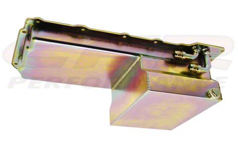 Upgrade your classic GM muscle car with this high-performance zinc-coated steel oil pan, designed for LS engine swaps. Built for durability, functionality, and improved oil control, this pan is perfect for both street and track applications.Key Features:Fitment: Compatible with GM LS-series engines in classic platforms.Can also be used in other applications with proper clearance.Sump Style: Rear sump for compatibility with factory crossmembers and improved chassis fitment.Oil Capacity: 7 quarts for extended oil supply during high-performance driving.Pan Depth: 6-inch deep with trap-door baffling for superior oil control during aggressive acceleration, braking, and cornering.Fittings: Includes 90-degree outlet fitting and 10AN ports for use with a remote oil filter system.Dipstick Compatibility: Designed to work with OEM-style dipsticks for easy maintenance and level checks.Material & Finish: Heavy-duty stamped steel with a corrosion-resistant zinc coating for long-lasting durability and heat resistance.