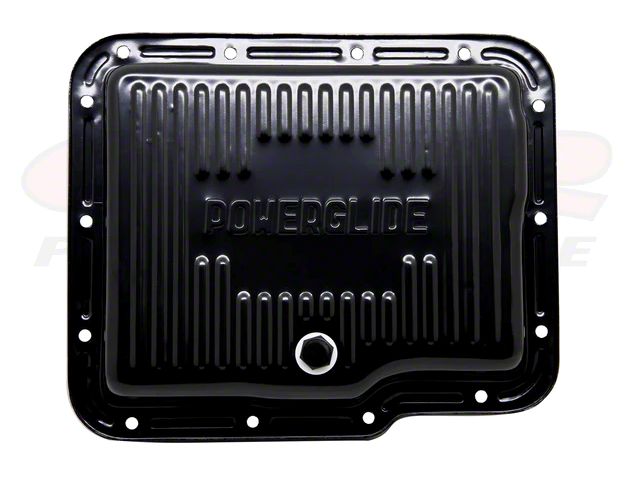 Chevy/GM finned black steel transmission pan fits Powerglide transmissions. Features a stamped Powerglide logo and comes with drain plug. Stock capacity. Depth: 2".