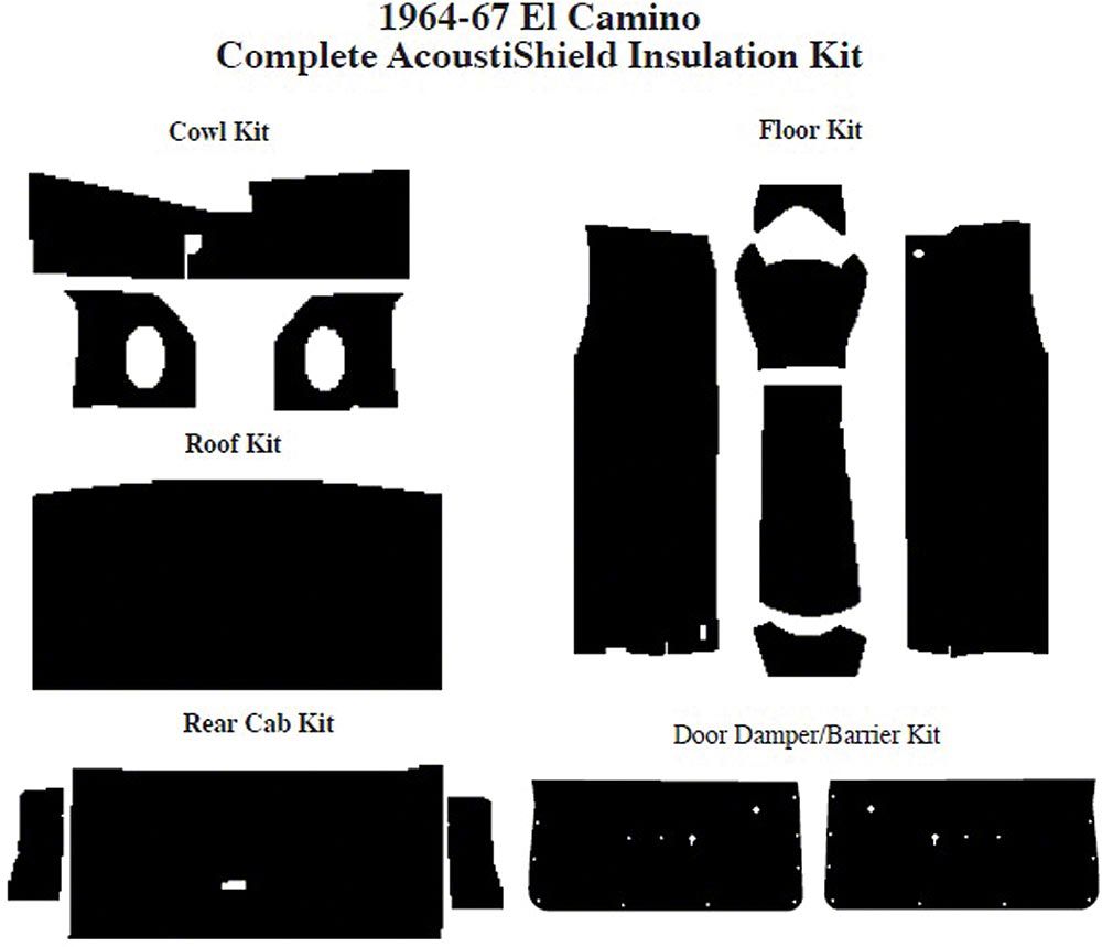 Introducing a multi-stage, automotive insulation and sound damping system to give older El Caminos the “quiet riding comfort” found in today's new vehicles coming off automotive assembly lines. These kits are designed on current, “state-of-the-art” auto acoustic technology, to insulate and control the noise, vibration and heat in the passenger cabin. These kits are pre-cut and ready-to-install in a couple of hours, with easy-to-follow illustrated instructions--everything you need to do the job right.