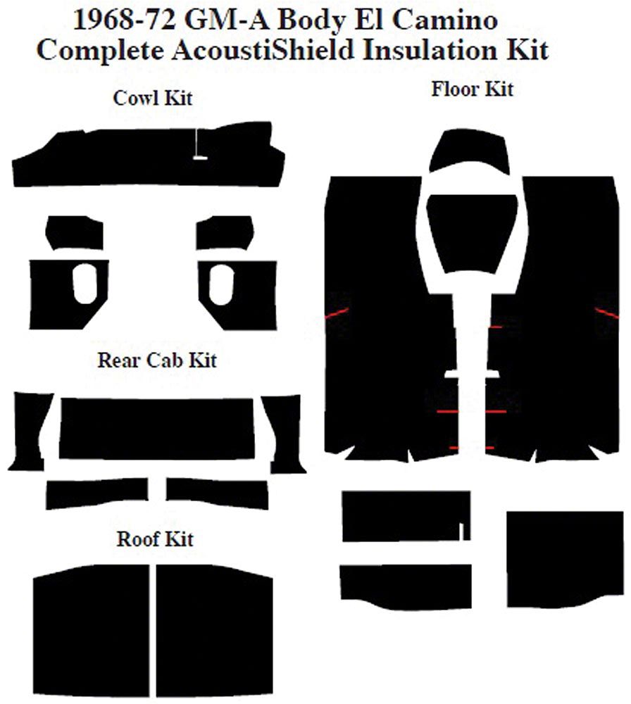 Introducing a multi-stage, automotive insulation and sound damping system to give older El Caminos the “quiet riding comfort” found in today's new vehicles coming off automotive assembly lines. These kits are designed on current, “state-of-the-art” auto acoustic technology, to insulate and control the noise, vibration and heat in the passenger cabin. These kits are pre-cut and ready-to-install in a couple of hours, with easy-to-follow illustrated instructions--everything you need to do the job right.