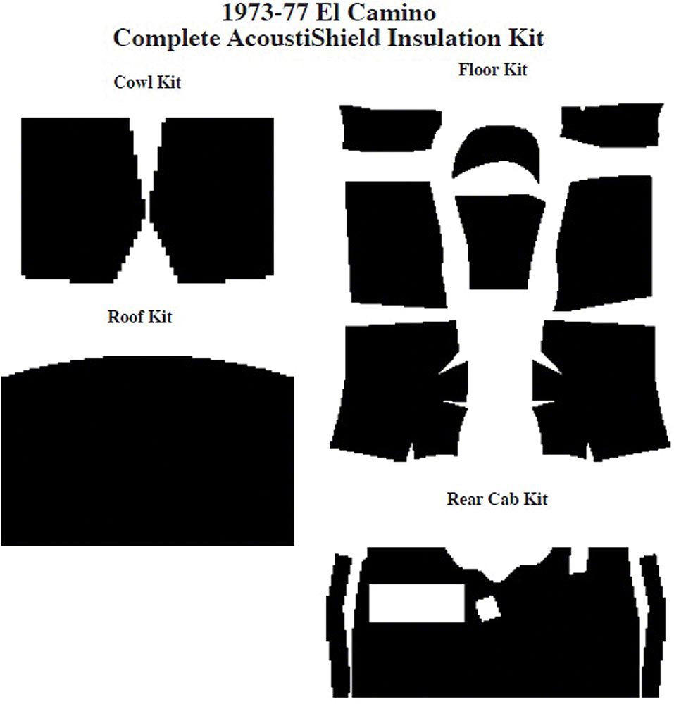 Introducing a multi-stage, automotive insulation and sound damping system to give 1973-1977 El Caminos the “quiet riding comfort” found in today's new vehicles coming off automotive assembly lines. These kits are designed on current, “state-of-the-art” auto acoustic technology, to insulate and control the noise, vibration and heat in the passenger cabin. These kits are pre-cut and ready-to-install in a couple of hours, with easy-to-follow illustrated instructions--everything you need to do the job right, for your 1973, 1974, 1975, 1976, 1977 El Camino. Trust The