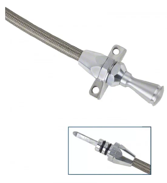 You have flexibility with our Teflon-lined Flexible Braided Stainless Transmission Dipstick. Kit comes complete with braided stainless outer housing and heat resistant E-Z to read flexible inner dipstick measuring cable. Inner cable is molded with appropriate trans fluid levels. Billet aluminum handle and billet aluminum fittings complement Lokar’s Flexible Engine Dipsticks. Kit includes dipstick funnel adapter to assist in filling. Designed for “push in” style transmissions. Dipstick seals with double O-rings. Firewall mount measures 24" in length. Transmount mounts to the bell housing and the length varies according to the transmission application. Kit comes complete with installation instructions. Always trust The El Camino Store for all your performance and restoration needs