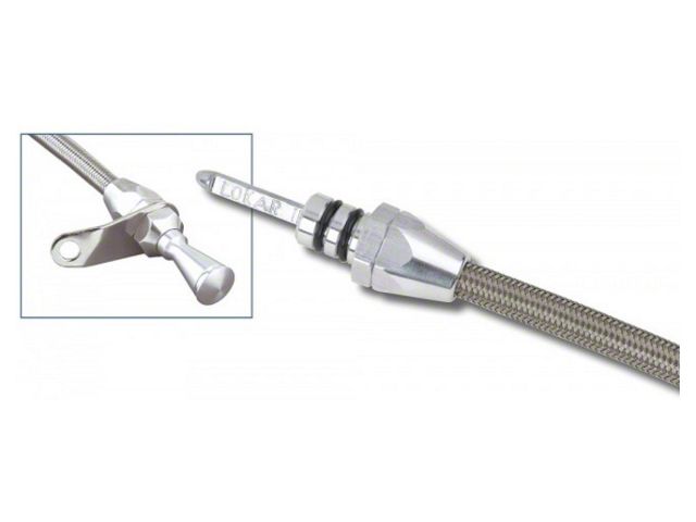 You have flexibility with our Teflon-lined Flexible Braided Stainless Transmission Dipstick. Kit comes complete with braided stainless outer housing and heat resistant E-Z to read flexible inner dipstick measuring cable. Inner cable is molded with appropriate trans fluid levels. Billet aluminum handle and billet aluminum fittings complement Lokar’s Flexible Engine Dipsticks. Kit includes dipstick funnel adapter to assist in filling. Designed for “push in” style transmissions. Dipstick seals with double O-rings. Applications available for GM, Ford and Chrysler in both firewall mount and transmount. Firewall mount measures 24" in length. Transmount mounts to the bell housing and the length varies according to the transmission application. Kit comes complete with installation instructions.