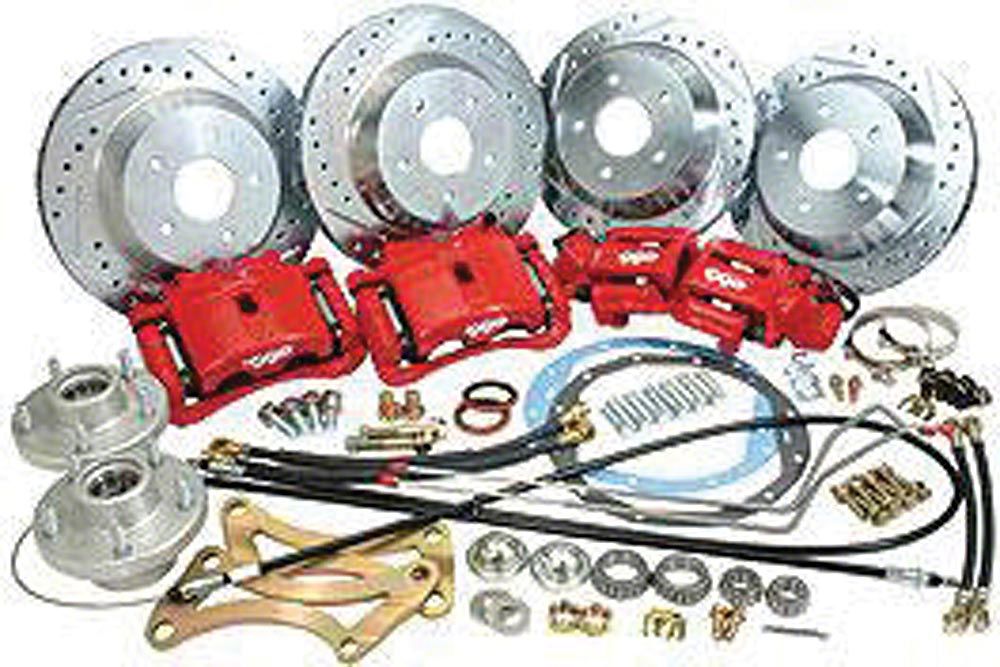 The front system uses a 13 inch cross-drilled, gas slotted and zinc washed rotor mounted to a 2024 T6 billet aluminum CNC machined anodized hub and a PBR C15 caliper that attaches to the spindle with a custom caliper mounting brackets. PBR C15 calipers have twin 52mm pistons and a larger brake pad surface area that offers about 60% more stopping power in the caliper that the popular C5 caliper at half the cost. The rear system uses a 12 inch cross-drilled, gas slotted and zinc washed rotor that mounts to the factory axle with the longer studs supplied and mates up to a Lincoln Continental emergency brake style caliper mounted to the rear axle housing with a custom caliper mounting bracket. These kits include all the bearings, seals, dust caps, brackets, cables, hoses, clips, instruction