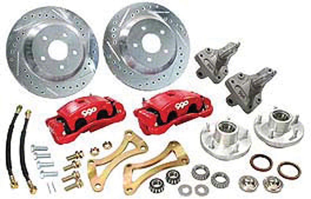 The front system uses a 13 inch cross-drilled, gas slotted and zinc washed rotor mounted to a 2024 T6 billet aluminum CNC machined anodized hub and a PBR C15 caliper that attaches to the spindle with a custom caliper mounting brackets. PBR C15 calipers have twin 52mm pistons and a larger brake pad surface area that offers about 60% more stopping power in the caliper that the popular C5 caliper at half the cost. This kits includes all the bearings, seals, dust caps, brackets, cables, hoses, clips, instructions and necessary hardware to assure a hassle free installation. includes drop spindles.