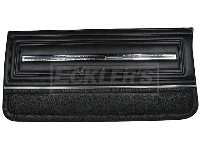 These door panels are accented with a chrome Mylar strip near the top and original "crushed ice" patterned vinyl for a carpet look at the bottom. These panels are further enhanced by the addition of the original metal style buttons. They come fully assembled and are sold in pairs.
