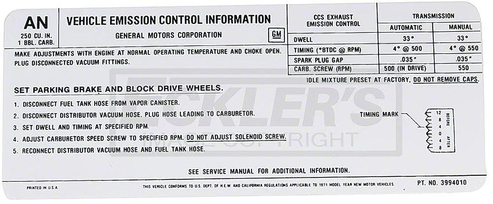 Emission Decal, 250 c.i. 1 Barrel, Automatic Or Manual Transmission, Code AN (1971 El Camino; 1971 Sprint)