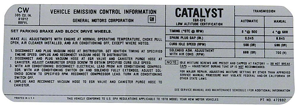 1978 El Camino & GMC Sprints sold in California and New York came factory with certain smog requirements including a visible emissions decal under the hood. Many states now have adopted California and New York standards above Federal standards setting the bar that much higher requiring in many cases clear display of these labels and decals. All 1971 and newer El Caminos have emissions labels or decals showing that they were manufactured to meet either California or U.S. Federal standards. This 1978 CW El Camino emissions label or decal is affixed in the engine compartment or in a readily accessible location. At the top of this El Camino Emissions label are the words VEHICLE EMISSION CONTROL INFORMATION and the corporate name or