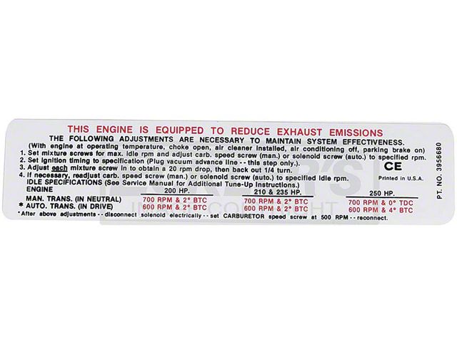 1969 El Camino & GMC Sprints sold in California and New York came factory with certain smog requirements including a visible emissions decal under the hood. Many states now have adopted California and New York standards above Federal standards setting the bar that much higher requiring in many cases clear display of these labels and decals. All 1971 and newer El Caminos have emissions labels or decals showing that they were manufactured to meet either California or U.S. Federal standards. This 1969 CE El Camino emissions label or decal is affixed in the engine compartment or in a readily accessible location. At the top of this El Camino Emissions label are the words VEHICLE EMISSION CONTROL INFORMATION and the corporate name or trademark of the GM. If you live in an area that r