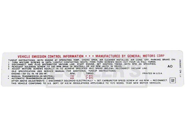 Emissions decals can add the finishing touch to your El Camino restoration. Although not required until 1971, some earlier models were equipped with smog control. 1970 El Caminos sold in California and New York came factory with certain smog requirements including a visible emissions decal under the hood. We are proud to offer a superior reproduction of the factory emissions decal. Be sure to check your original, since these crisply printed decals are specially coded to your car. The El Camino Store offers a full line of emissions and underhood decals to help get your 1970 El Camino looking showroom new. Trust the El Camino Store for all your El Camino needs, from daily driver, show, or just to enjoy, we can get you there.
