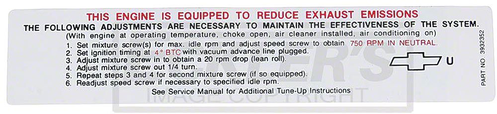 Emissions decals can add the finishing touch to your El Camino restoration. Although not required until 1971, some earlier models were equipped with smog control. 1968 El Caminos sold in California and New York came factory with certain smog requirements including a visible emissions decal under the hood. We are proud to offer a superior reproduction of the factory emissions decal. Be sure to check your original, since these crisply printed decals are specially coded to your car. The El Camino Store offers a full line of emissions and underhood decals to help get your 1968 El Camino looking showroom new. Trust the El Camino Store for all your El Camino needs, from daily driver, show, or just to enjoy, we can get you there.