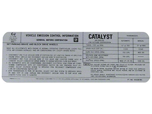 1979 El Camino & GMC Sprints sold in California and New York came factory with certain smog requirements including a visible emissions decal under the hood. Many states now have adopted California and New York standards above Federal standards setting the bar that much higher requiring in many cases clear display of these labels and decals. All 1971 and newer El Caminos have emissions labels or decals showing that they were manufactured to meet either California or U.S. Federal standards. This 1979 CJ El Camino emissions label or decal is affixed in the engine compartment or in a readily accessible location. At the top of this El Camino Emissions label are the words VEHICLE EMISSION CONTROL INFORMATION and the corporate name or trademark