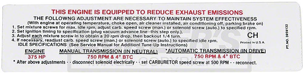 Emissions decals can add the finishing touch to your El Camino restoration. Although not required until 1971, some earlier models were equipped with smog control. 1969 El Caminos sold in California and New York came factory with certain smog requirements including a visible emissions decal under the hood. We are proud to offer a superior reproduction of the factory emissions decal. Be sure to check your original, since these crisply printed decals are specially coded to your car. The El Camino Store offers a full line of emissions and underhood decals to help get your 1969 El Camino looking showroom new. Trust the El Camino Store for all your El Camino needs, from daily driver, show, or just to enjoy, we can get you there.