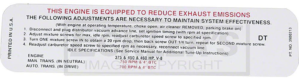 Emission Decal, Early Year 454 c.i. 4 Barrel 450Hp, Automatic Or Manual Transmission, Code DT (1970 El Camino)