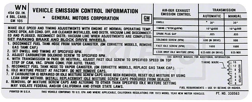 Emission Decals 454 c.i. 4 Barrel, Automatic Or Manual Transmission, Code WN (1973 El Camino; 1973 Sprint)
