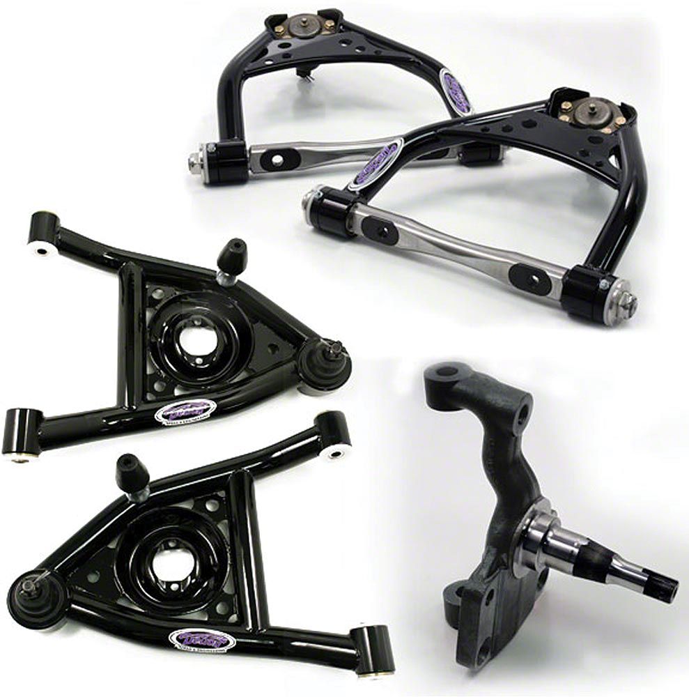 Detroit Speed control arm and spindle kit is designed to work as an integrated system on your vehicle. The Detroit Speed spindle is 1-1/2" taller than the stock spindle and provides 2" of drop from stock height. The taller spindle height improves handling by modifying the camber curve resulting in a negative camber gain during suspension compression. The stock steer arms mount in the optimal location to minimize bump steer. DSE’s El Camino tubular upper control arms provide increased strength and additional positive caster. They feature five axis laser cut tube ends and ball joint pockets for a precise fit. The upper control arms are TIG welded in fixtures to guarantee geometric accuracy and repeatability. They have Delrin bushings, new ball joints, and a gloss black powdercoat finis