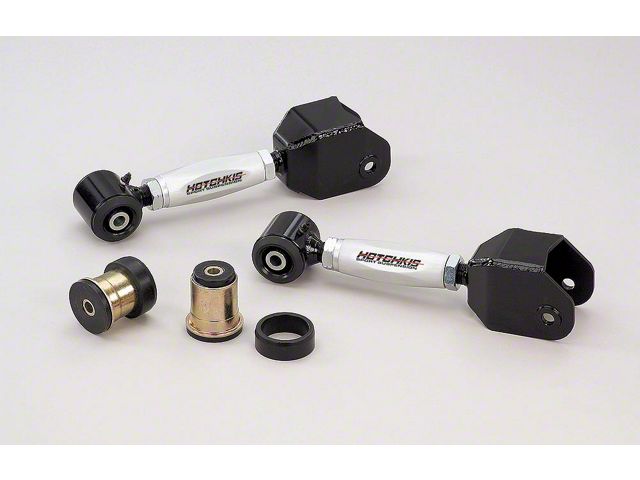 Hotchkis Performance adjustable upper trailing arms improve traction, reduce wheel hop, and improve handling and stability. The adjustable design allows for pinion angle adjustments to correct drive line vibrations or to improve launches. Designed as direct replacements for weak stock trailing arms, Hotchkis trailing arms feature Tig welded construction from one piece of parent material, quiet operating greasable polyurethane bushings, and a powder coated finish. Black Powder coat. Specs:Length Stock Arm 12.800" 1203A 12.332"-13.300"