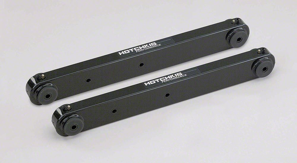 Hotchkis Performance lower trailing arms improve traction, reduce wheel hop, and improve handling and stability. Designed as direct replacements for weak stock trailing arms, Hotchkis trailing arms feature Tig welded construction from one piece of parent material, quiet operating greasable polyurethane bushings, sway bar mounts and a powder coated finish. Black Powder coat. Specs: Length 22.25"