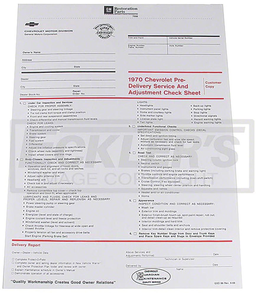 This El Camino reproduction pre delivery sheet has been manufactured to original factory specifications using today's modern manufacturing techniques. You will find the fit, finish and function will work superbly for your restoration. In addition, using a reproduction pre delivery sheet from the El Camino Store will add authenticity and value to your vehicle.