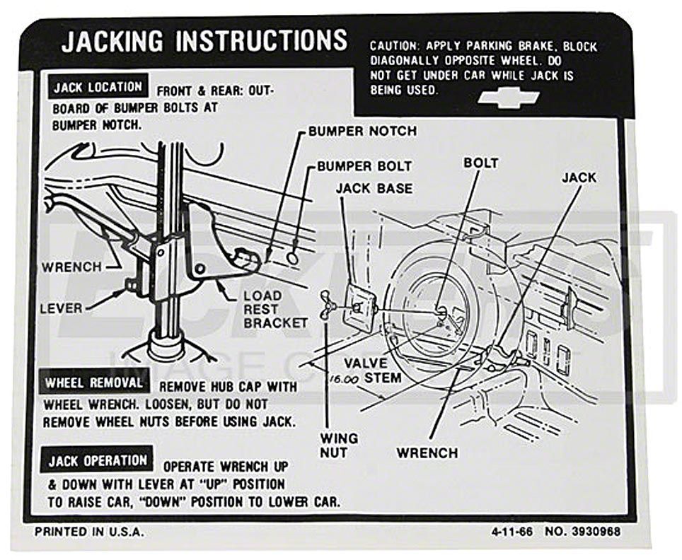 This El Camino reproduction jacking instruction decal has been manufactured to original factory specifications using today's modern manufacturing techniques. You will find the fit, finish and function will work superbly for your restoration. In addition, using a reproduction jacking instruction decal from the El Camino Store will add authenticity and value to your vehicle.