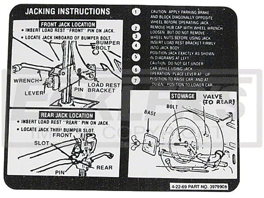 This El Camino reproduction jacking instruction decal has been manufactured to original factory specifications using today's modern manufacturing techniques. You will find the fit, finish and function will work superbly for your restoration. In addition, using a reproduction jacking instruction decal from the El Camino Store will add authenticity and value to your vehicle.