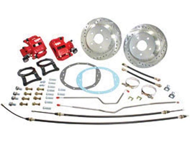 The rear system uses a 12" cross-drilled, gas slotted and zinc washed rotor that mounts to the factory axle with the longer studs supplied and mates up to a Lincoln Continental emergency brake style caliper mounted to the rear axle housing with a custom caliper mounting bracket. This kit includes all the bearings, seals, dust caps, brackets, cables, hoses, clips, instructions and necessary hardware to assure a hassle free installation