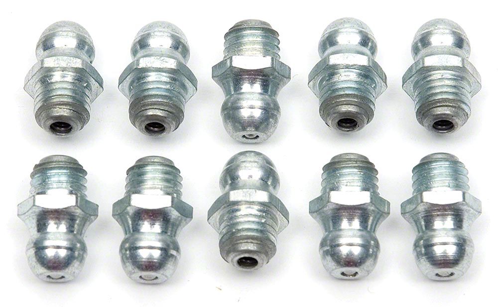 These are the fasteners needed to assemble steering and suspension related components. Most fasteners have correct markings for the time period. Kit includes ten straight grease fitting.