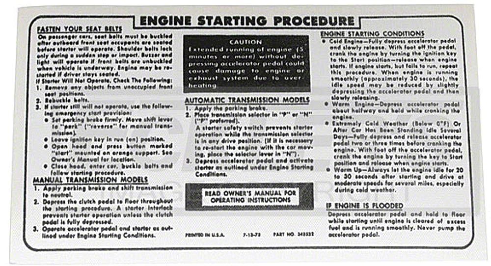 This El Camino reproduction starting instruction sleeve has been manufactured to original factory specifications using today's modern manufacturing techniques. You will find the fit, finish and function will work superbly for your restoration. In addition, using a reproduction starting instruction sleeve from the El Camino Store will add authenticity and value to your vehicle.