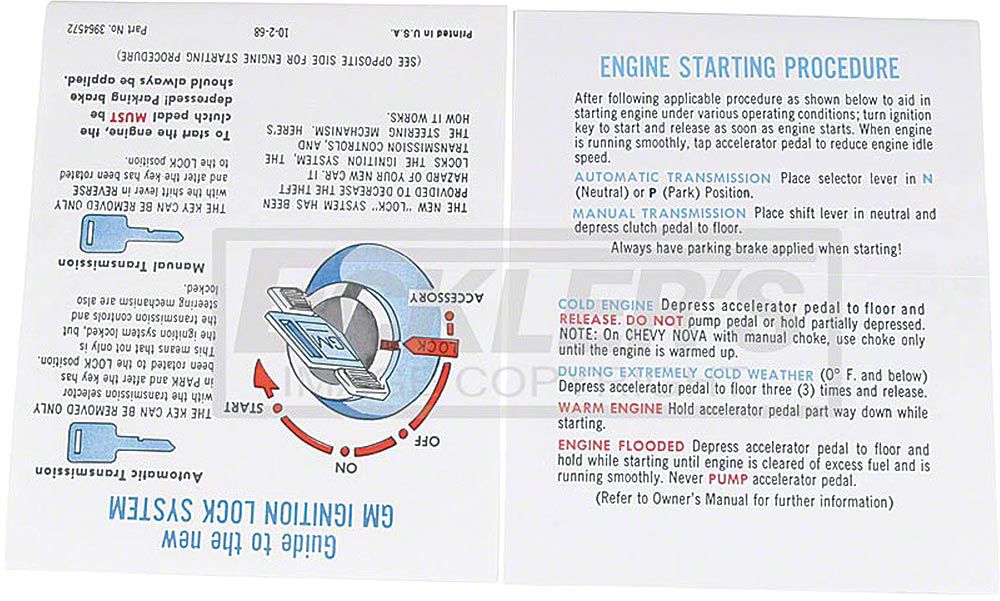 This El Camino reproduction starting instruction sleeve has been manufactured to original factory specifications using today's modern manufacturing techniques. You will find the fit, finish and function will work superbly for your restoration. In addition, using a reproduction starting instruction sleeve from the El Camino Store will add authenticity and value to your vehicle.