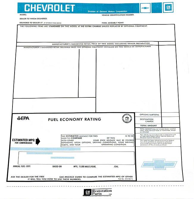 - Reproduction Of Original Official Window Sticker As Found On Your El Camino When New