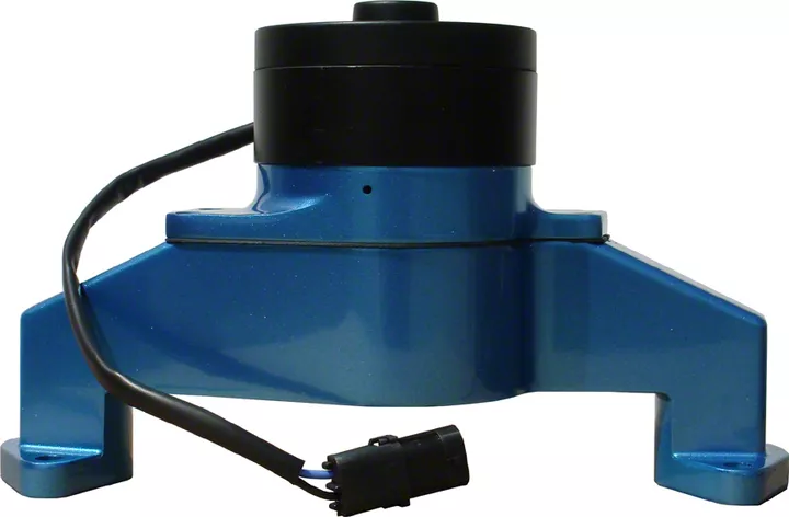 Electric Engine Water Pump; Fits Big Block Chevy Engines; Made From Die Cast Aluminum; Body Has Blue Finish and Motor Has Black Finish; Flows 35 GPM; Billet 1.0 Inch NPT to 1-3/4 Inch Hose Fitting Included; Sold Individually