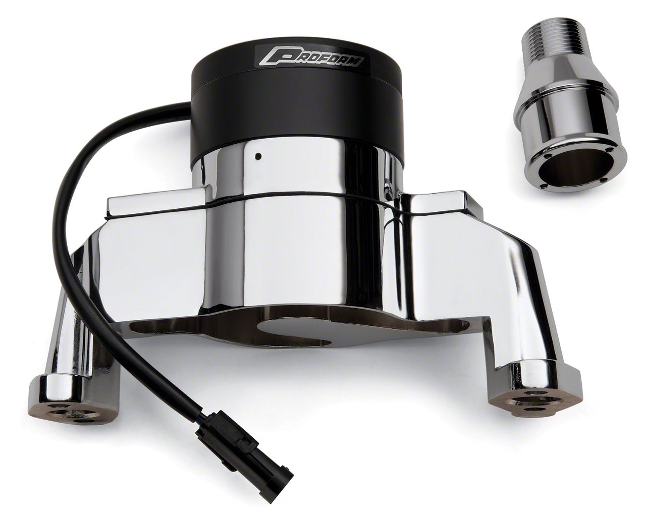 Electric Engine Water Pump; Fits Small Block Chevy Engines; Made From Die Cast Aluminum; Body Has A Polished Finish and Motor Has Black Finish; Flows 35 GPM; Billet 1.0 Inch NPT to 1-3/4 Inch Hose Fitting Included; Sold Individually