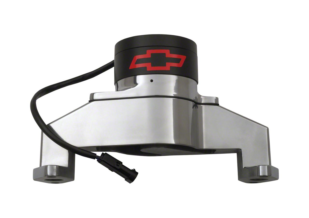 Electric Engine Water Pump; Fits BB Chevy Engines; Made From Die Cast Aluminum; Body Has A Polished Finish and Motor Has Black Finish With Red Bowtie Logo; Flows 35 GPM; Billet 1.0 Inch NPT to 1-3/4 Inch Hose Fitting Included; Sold Each
