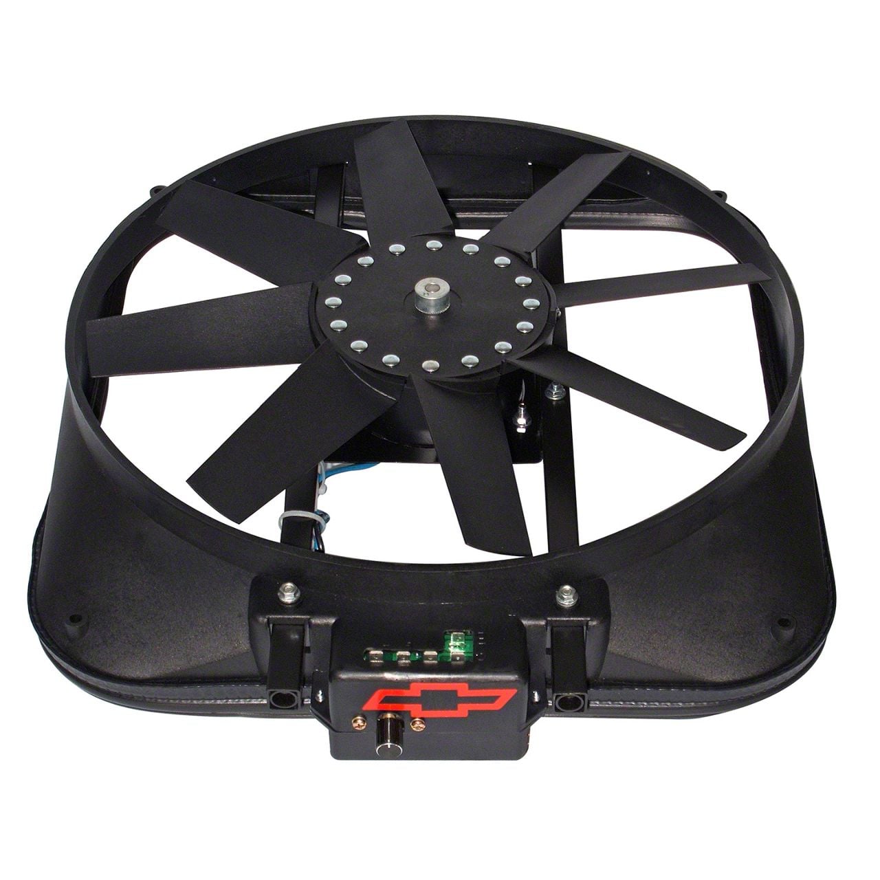 Electric Radiator Fan Kit; High Performance Model w/Bowtie; 15 Inch Diameter; 2800CFM Rating; Included Thermostat; 14 Amp Draw; Measures 16.5in. Wide X 18.5in. High X 4in. Thick; Nylon Tie Mounting Kit Included; GM Licensed