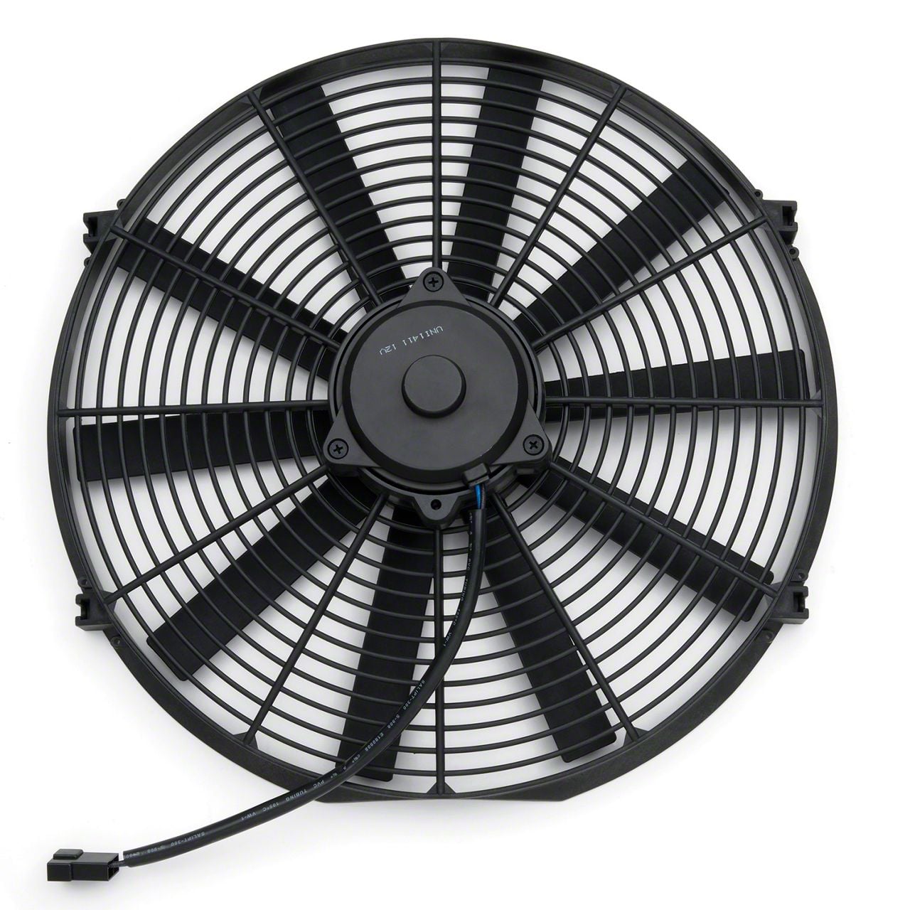 Electric Radiator Fan Kit; High Performance Model; 16 Inch Diameter; 2000 RPM and 2100CFM Rating; 9 Amp Draw; Uses a 30 Amp Fuse; Measures 16.5in. Wide X 16.75in. High X 4in. Thick; Nylon Tie Mounting Kit Included