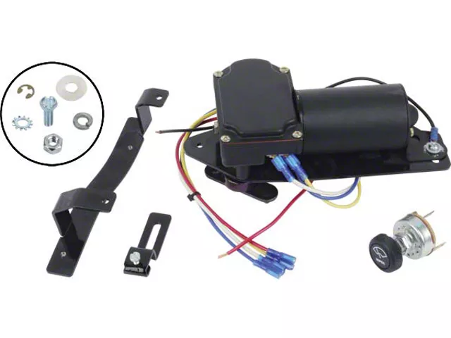 The electric wiper motor conversion kits are designed to bolt in place of the stock vacuum wiper motor. The motor is heavy duty, 2 speed and self-parking. Kit includes mounting brackets, dash mount switch, fuse and instructions. Will not work on cars with original radios.