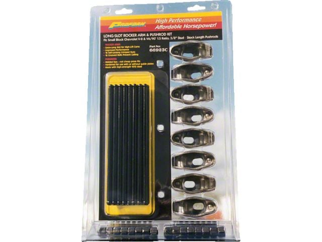 Engine Rocker Arm and Push Rod Kit; Long Slot Style; 1.5 Ratio; 3/8 Stud; Standard 5/16 Diameter; 7.800 Inch Pushrod length; Fits Small Block Chevy Engines 1955-1997 262-400 Engines; Sold As One Complete Kit