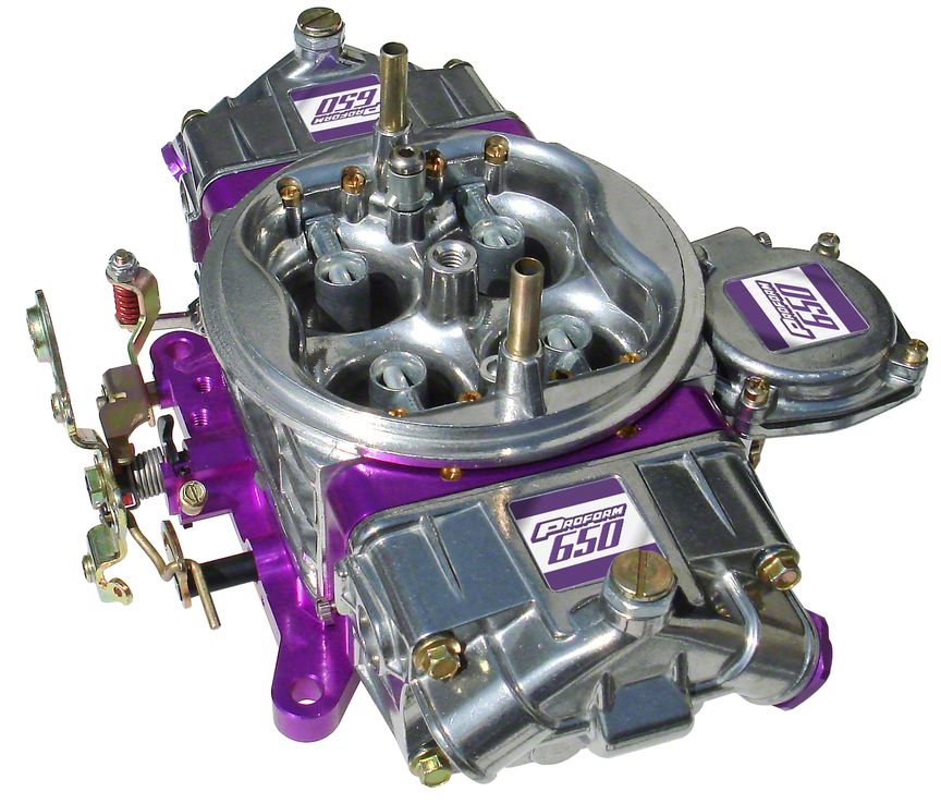 Engine Carburetor; Race Series Model; 650 CFM Dual Inlet 4-Barrel With Vacuum Secondaries; Square Type Bore Mount; Features Billet Aluminum Plates and A Dichromate Finish; No Choke; Assembled With 100% New Components; Sold Each