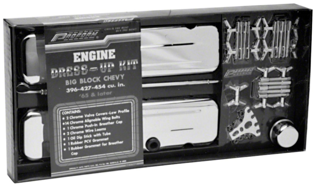 Engine Dress-Up Kit; Chrome Finish; Steel Material; Fits Big Block Chevy Engines; Includes Stock Height Baffled Valve Covers, 1 Push-In Breather, 1 PCV Grommet, Oil Dipstick,14 Deluxe Valve Cover Wing Nuts and 2 Wire Looms; Sold As One Kit