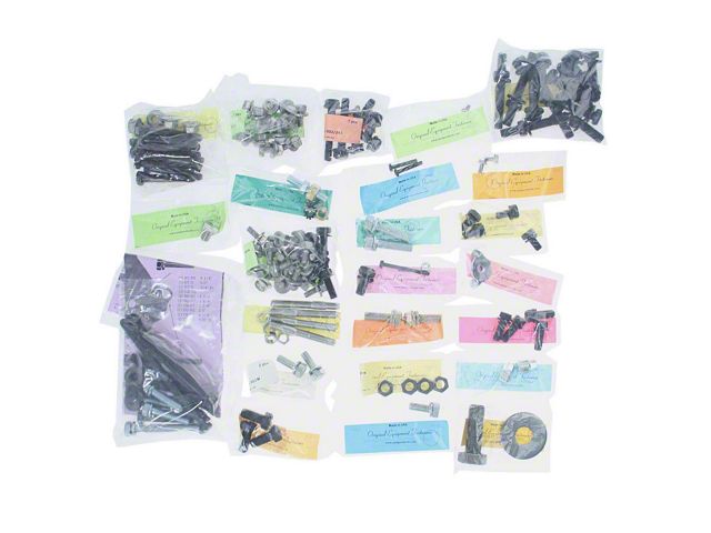 Master Kits include O.E. hardware to attach the following item: Air cleaner, Carburetor, Crankshaft pulley, Distributor, Engine tag, Exhaust manifolds, Fuel pump, Heat shroud, Ignition coil, Intake manifold, Oil filter adapter, Oil pan, Timing cover, Valve covers, Water neck, and water pump, 1964-1965 kits include exhaust lock tabs; 1966 and later year kits have Ramp-Lok bolts. Also, all small block kits listed (8 cylinder 289 and 302) include a detailed water pump bolt placement illustration.