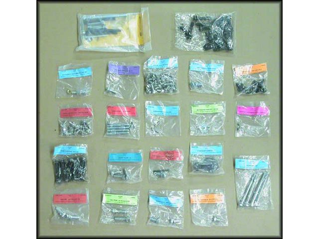 Master Kits include O.E. hardware to attach the following item: Air cleaner, Carburetor, Crankshaft pulley, Distributor, Engine tag, Exhaust manifolds, Fuel pump, Heat shroud, Ignition coil, Intake manifold, Oil filter adapter, Oil pan, Timing cover, Valve covers, Water neck, and water pump, 1964-1965 kits include exhaust lock tabs; 1966 and later year kits have Ramp-Lok bolts. Also, all small block kits listed (8 cylinder 289 and 302) include a detailed water pump bolt placement illustration.