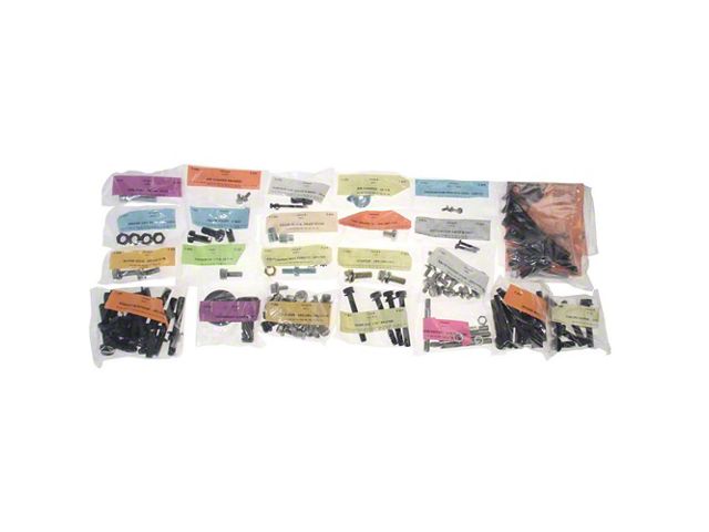 Master Kits include O.E. hardware to attach the following item: Air cleaner, Carburetor, Crankshaft pulley, Distributor, Engine tag, Exhaust manifolds, Fuel pump, Heat shroud, Ignition coil, Intake manifold, Oil filter adapter, Oil pan, Timing cover, Valve covers, Water neck, and water pump, 1964-1965 kits include exhaust lock tabs; 1966 and later year kits have Ramp-Lok bolts. Also, all small block kits listed (8 cylinder 289 and 302) include a detailed water pump bolt placement illustration.