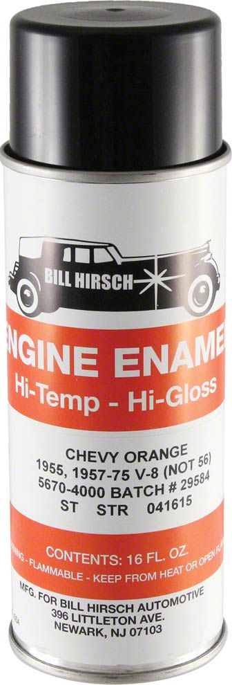 This Chevy engine orange spray enamel paint matches the original Chevrolet color used on small block Chevy engines. Use this paint for in-car touch ups or complete removal and repaints where a spray gun cannot be used. After the engine surface is clean and free of old paint flakes and grease, the paint can be applied directly to the engine casting. A spray primer surfacer is recommended when painting steel items like valve covers and timing chain covers. For overall engine repaints, 4 cans are recommended to complete the job. Make it look original with Chevy engine orange spray paint.