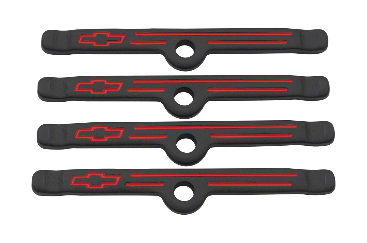 Engine Valve Cover Holdown Clamps; Black Crinkle Finish With Red Bowtie Logo; Fits 1955-1986 262-400 Small Block Chevy V8 and V6 Engines; Made From High-Quality Steel; Officially Licensed GM Performance Product; Sold As One Set Of 4 Pieces
