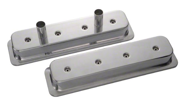 Engine Valve Cover; Center Bolt Circle-Track Style Baffled with Tubes on Breather One Cover; Polished Finish With No logos; Fits 1987 to 2000 305-350 Small Block Chevy Engines; Made from Quality Die Cast Aluminum Material; Sold as One Pair