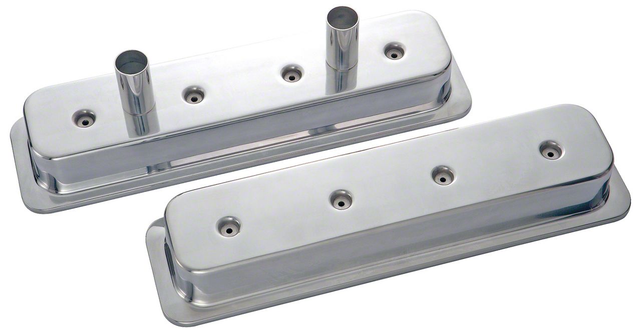 Engine Valve Cover; Center Bolt Circle-Track Style Baffled With Breather Tubes On One Cover; Polished Finish; No Logos; Fits 87-Up 305-350 Small Block Chevy Engines; Made From Die Cast Aluminum Material; Officially Licensed; Sold As 1-Pair