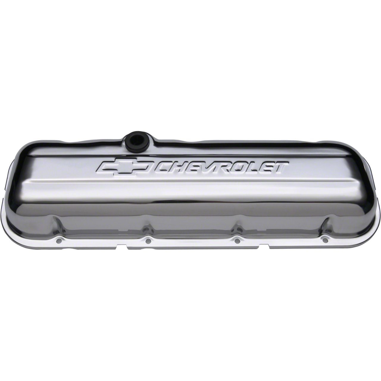 Engine Valve Cover; Stamped Steel Short Style With Baffles; Chrome Plated Finish With Chevy and Bowtie Logo; Fits 1965 to 1996 396-454 Big Block Chevys; Made From Quality Material; Officially Licensed GM Product; Sold As One Pair