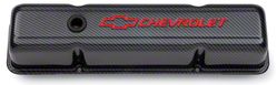 Engine Valve Cover; Stamped Steel Tall Style With Baffles; Carbon-Style Finish With Red Chevy and Bowtie Logos; Fits 1955 to 1986 262-400 Small Block Chevy Engines; Made From Quality Material; Officially Licensed GM Product; Sold As Pair