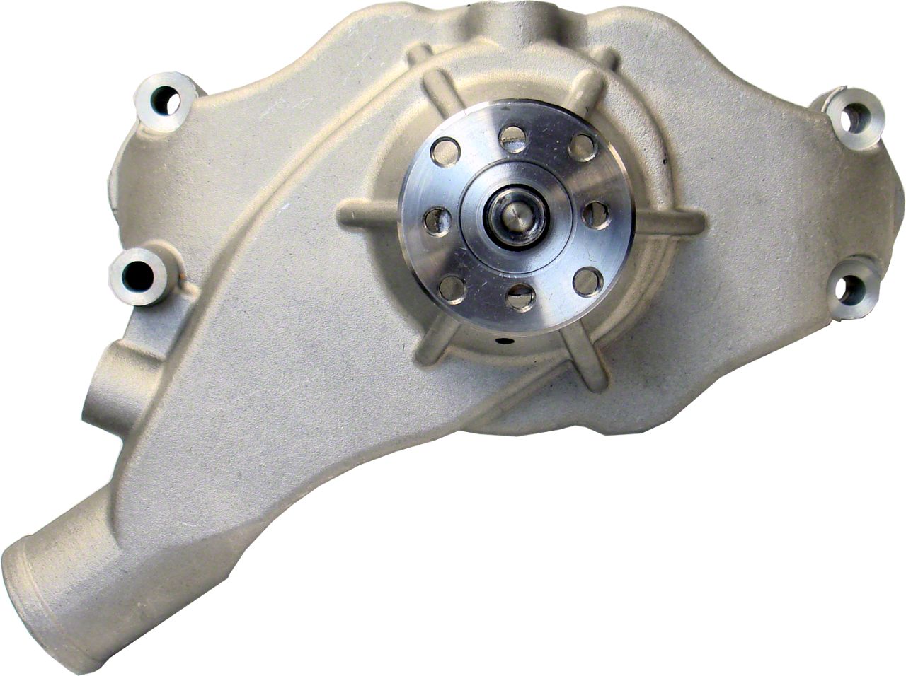 Engine Water Pump; Fits Big Block Chevy Engines; High-Flow Model; Mechanical Type; Short Style Pump; Made from High-Quality Aluminum; Satin Finish; Heavy-Duty Ball Bearings; Sold Each